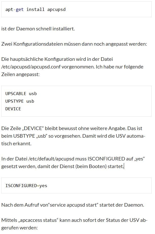 ich würde jetzt gerne noch mein Qnap TS-431P an die gleiche USV hängen. Das Problem ist, dass die USV nur einen USB anschluss hat und ich sie so nicht an das NAS anschließen kann. Im NAS könnte ich unter "Externe Geräte" eine Netzwerk-USV einstellen, aber ich denke nicht, dass das vom Plugin ausgegeben wird.