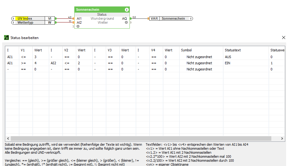Dafür nehme ich den UV INDEX und den WETTERTYP. Wenn der UV INDEX über 3 ist und der Wettertyp kleiner gleich 2 dann geht der Sonnenschein auf EIN.