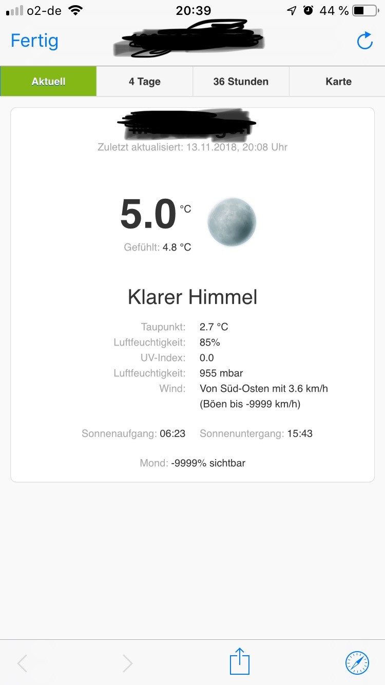 Nur bei „Mond“ und bei „Böhen“ zeigt es mir -99999 an. Scheint wohl Weatherbit nicht zu übertragen was ich aber nicht schlimm finde.