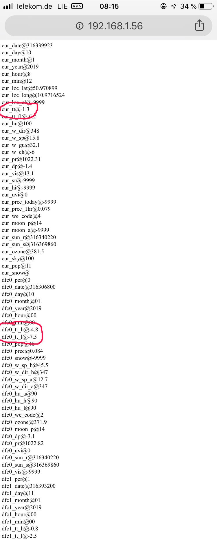 Eine manuelle API-Abfrage (https://api.darksky.net/forecast/xxx...y,alerts,flags) ergab "temperatureHigh":-0.78," und "temperatureLow":-3.72".