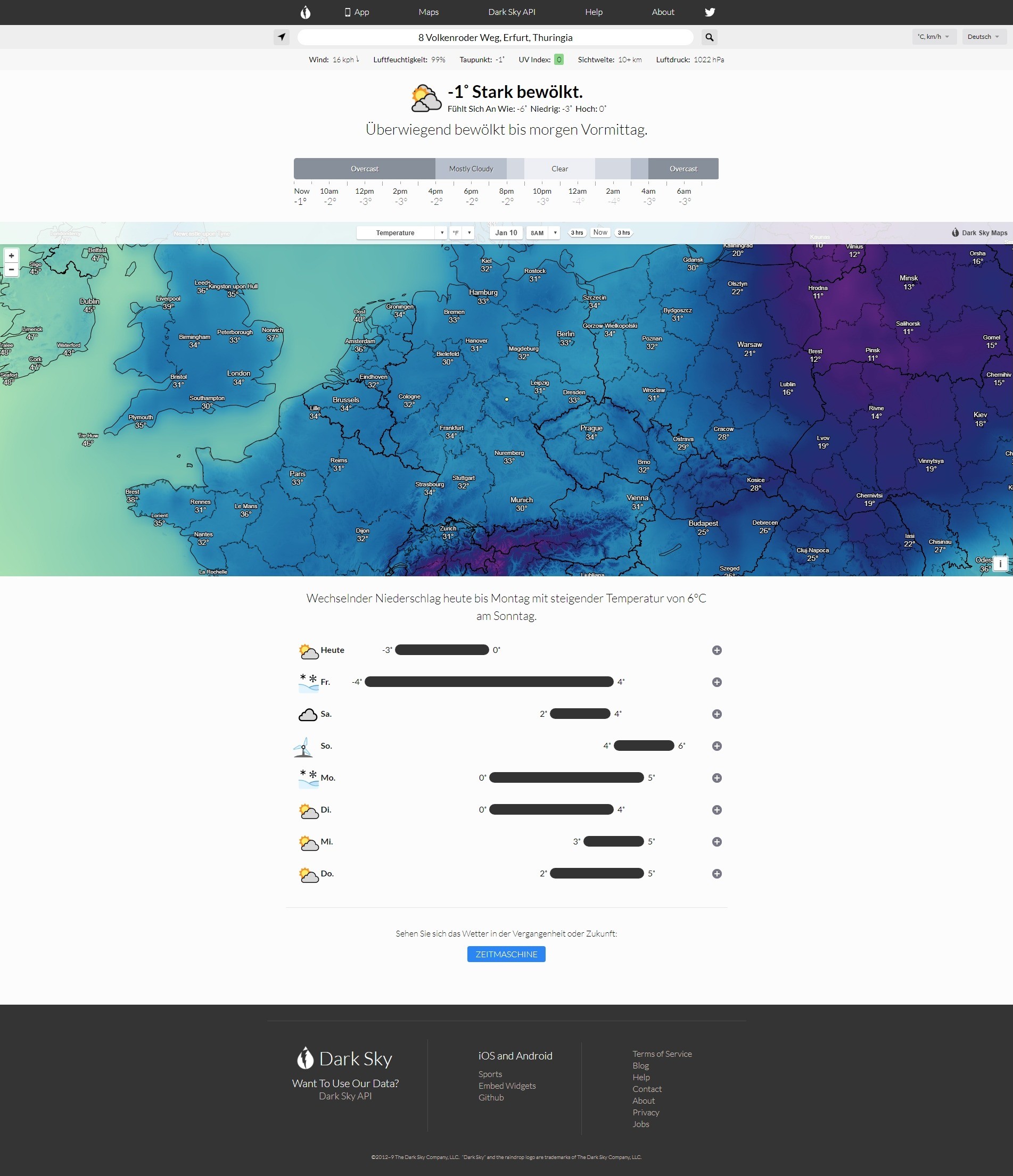 Die Vorschau in DarkSky zeigte mir für heute -3 bis 0 Grad (vgl. Screenshot). Die HTML-Seite vom Plugin zeigte mir -7,5 bis -4,8 Grad (vgl. Screenshot).