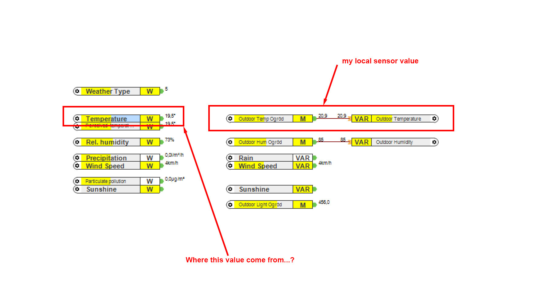 If you want to use your own temperature sensor, feed the new VAR block with the output of your sensor. The VAR block is updated as soon as the value of the sensor changed. You can use it as outdoor temperature in your whole program.