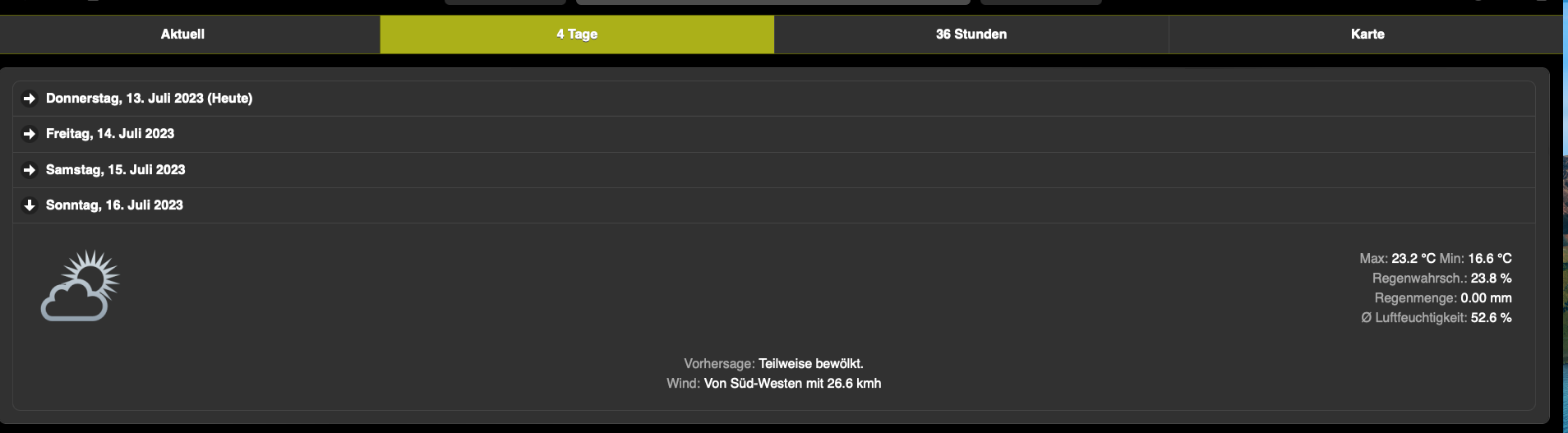 Klicke ich auf Wolken oder 0 Grad und komme in die Detailansicht, stimmen zwar die groben Werte aber nicht die Vorhersage.