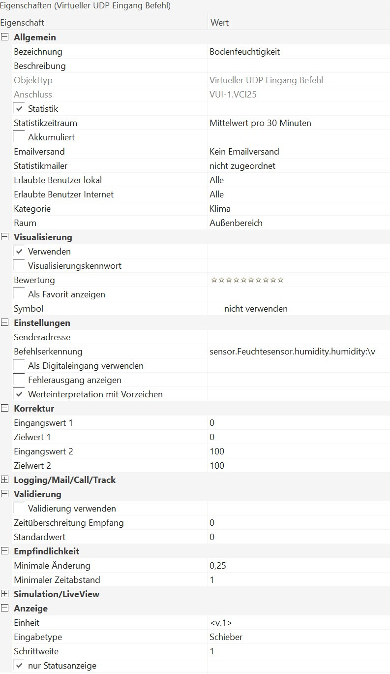 Danke für die Antwort. Könntest du mir ggf. Mal zeigen wie du den Virtuellen Eingang eingestellt hast und die Anzeige für die Bodenfeuchte? Vielleicht habe ich irgendwo einen Fehler drin..