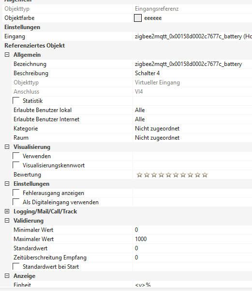 Ich versuche mich momentan mit der Einbindung von Xiaomi Produkten. Als erstes wollte ich den Xiaomi Schalter (WXKG01LM) anlernen jedoch wird nur der "linkquality" Wert an den Loxone Server übertragen?! Die Werte "battery,voltage,click" werden nicht übernommen. Bei click habe ich eine conversion von single = 1 eingetragen und dies wird auch vom MQTT Gateway richtig verarbeitet jedoch in Loxone erhalte ich die Werte nicht!? Übersehe ich hier etwas?