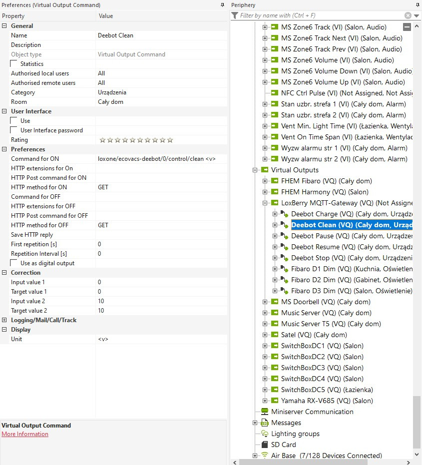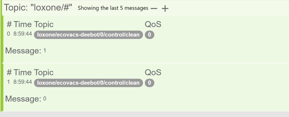 Ich habe heute dieses seltsame Problem... Es ist nicht gerade ein Problem mit dem MQTT-Gateway, aber es geht darum Befehle von Loxone an das MQTT-Gateway zu übergeben. Ich bin dabei, die Integration von Deebot Ozmo 950 in Miniserver mithilfe von MQTT zu implementieren (beide Richtungen: zur Überwachung des Status / der Verbrauchsmaterialien und zur robot Steuerung).