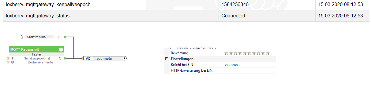 Ich setze das MQTT Plugin in Version 1.1.1 mit Loxberry Version 2.0.1.3 ein. Ein Klick auf der Plugin-Seite auf "Retransmit all data (for testing)" hat keinerlei Auswirkungen auf das oben beschrieben Verhalten. Ich habe zusätzlich einen "reconnect" UDP Befehl bei Neustart des Miniservers implementiert. Der "reconect" Befehl wird vom Loxberry anscheinend auch empfangen, siehe Screensot. An dem Status ändert sich aber ebenfalls nichts.