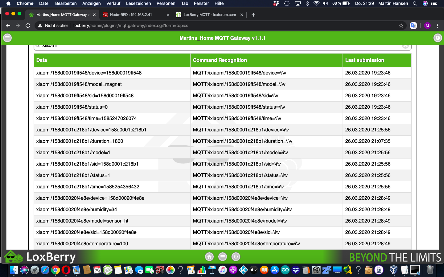 | define lb_mosquitto MQTT loxberry:1883 loxberry <deinMQTTPasswort> define mqttGeneric MQTT_GENERIC_BRIDGE attr mqttGeneric IODev lb_mosquitto attr mqttGeneric globalDefaults sub:qos=2 pub:qos=0 retain=1 attr mqttGeneric globalPublish *:topic={"fhem/$device/$reading"} |