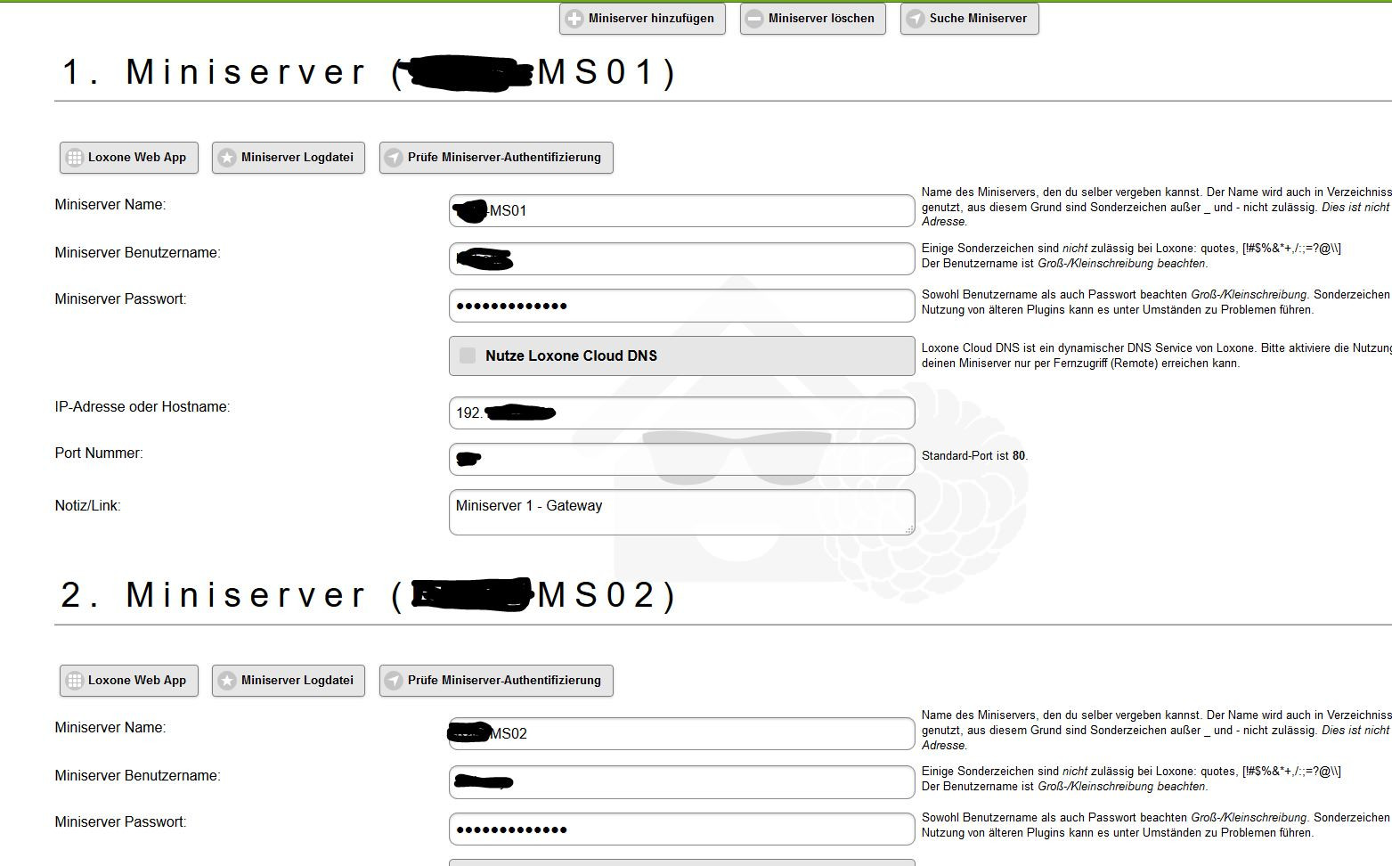 Danke für den Tipp mit dem Selbsttest! Kommunikation zum Miniserver ging nicht, weil ich Pfosten das PW geändert hab