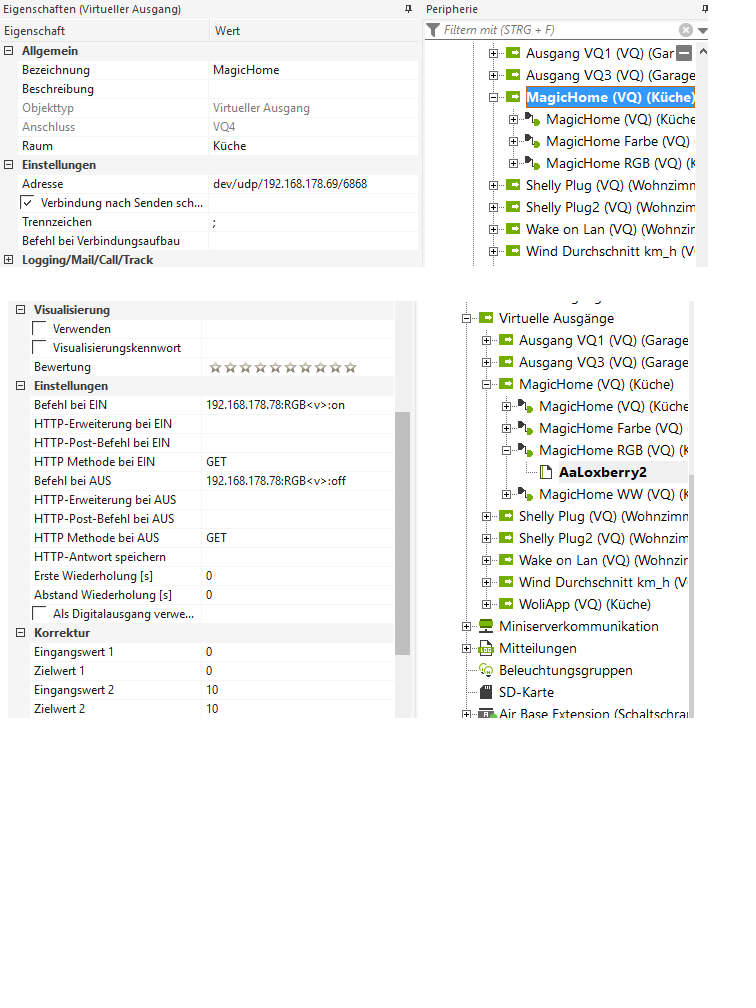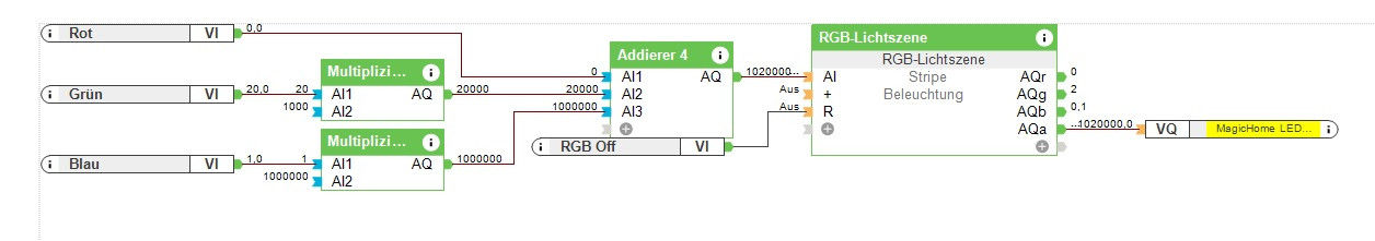 Als der Status abgerufen wurde war Grün auf 20 % und Blau auf 1 % (Einstellung in Loxone).