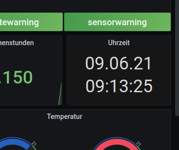 Zum Einen wird die Uhrzeit natuerlich passend (und mit Datum) im Block dargestellt - das liegt wohl im Fehlen des Plugins grafana-clock-panel begruendet: