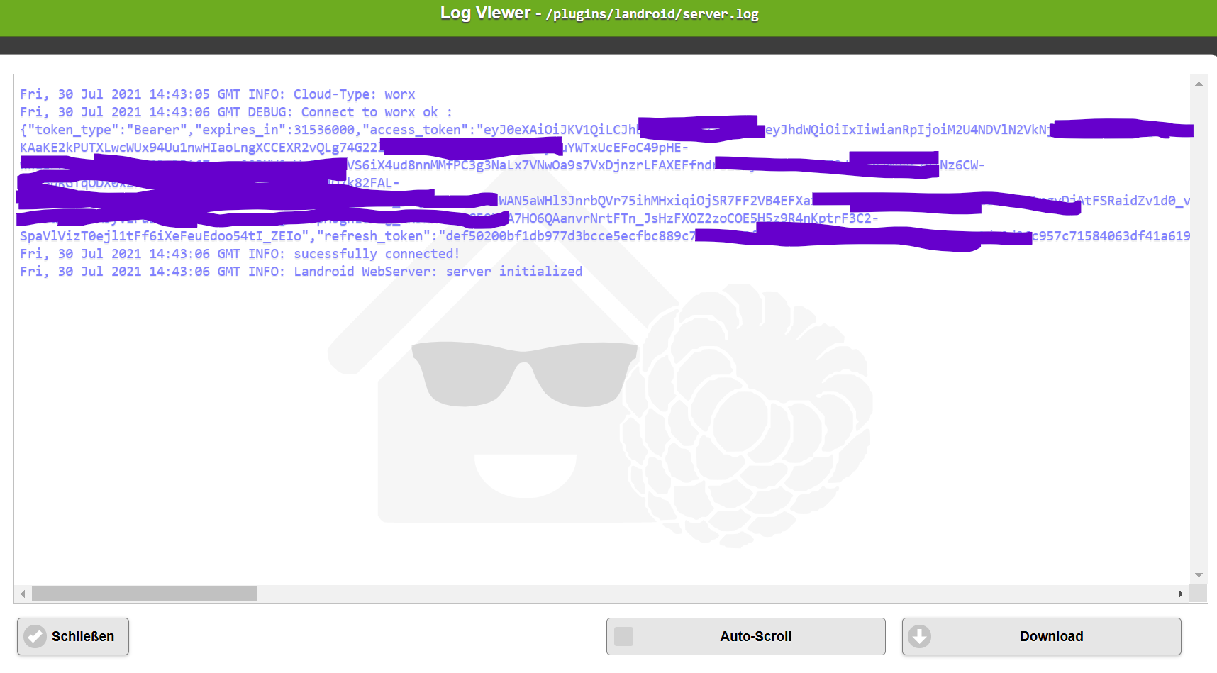 Fri, 30 Jul 2021 14:43:06 GMT DEBUG: Connect to worx ok : {"token_type":"Bearer","expires_in":31536000,"a cce ss_token":"MEIN TOKEN"