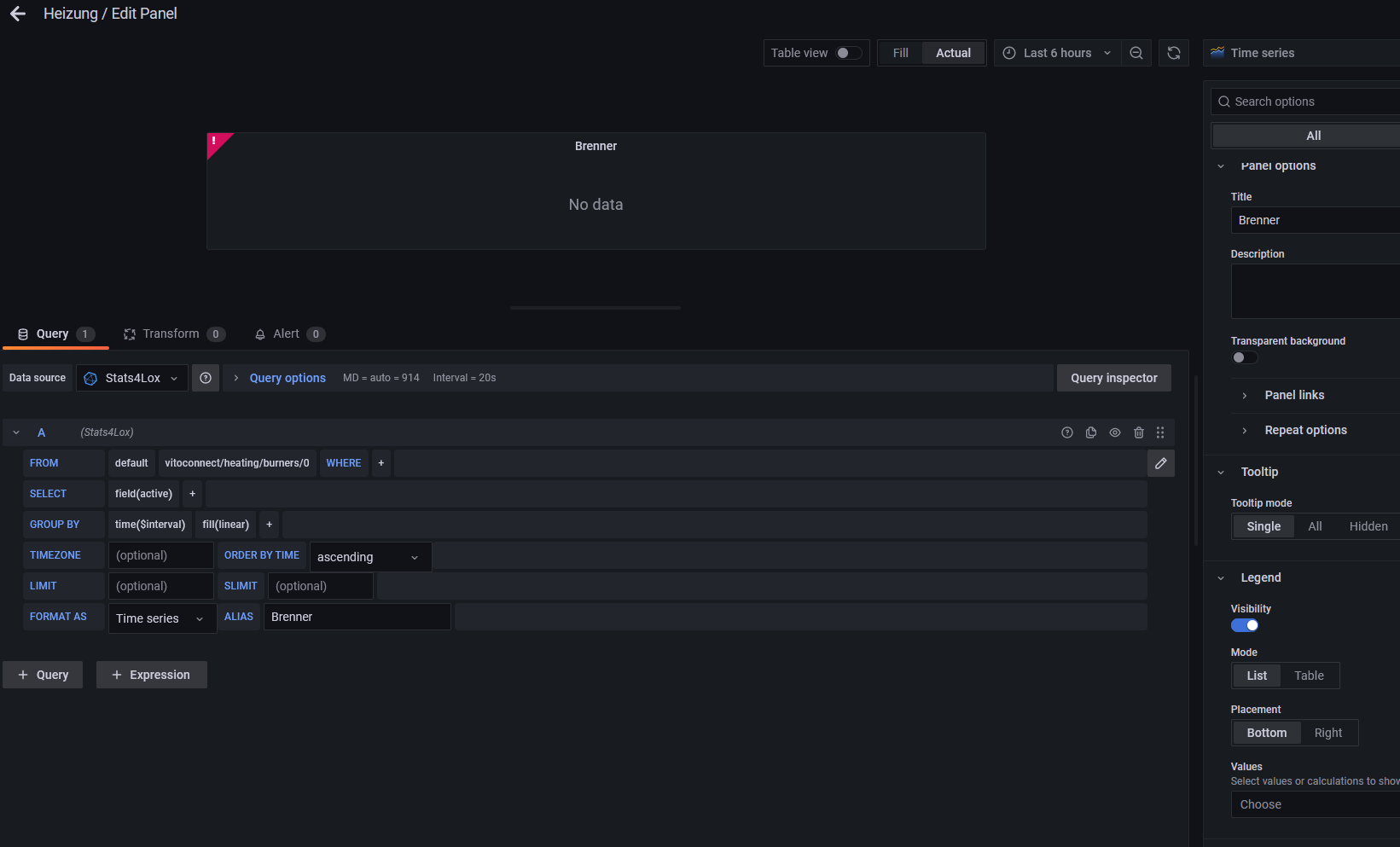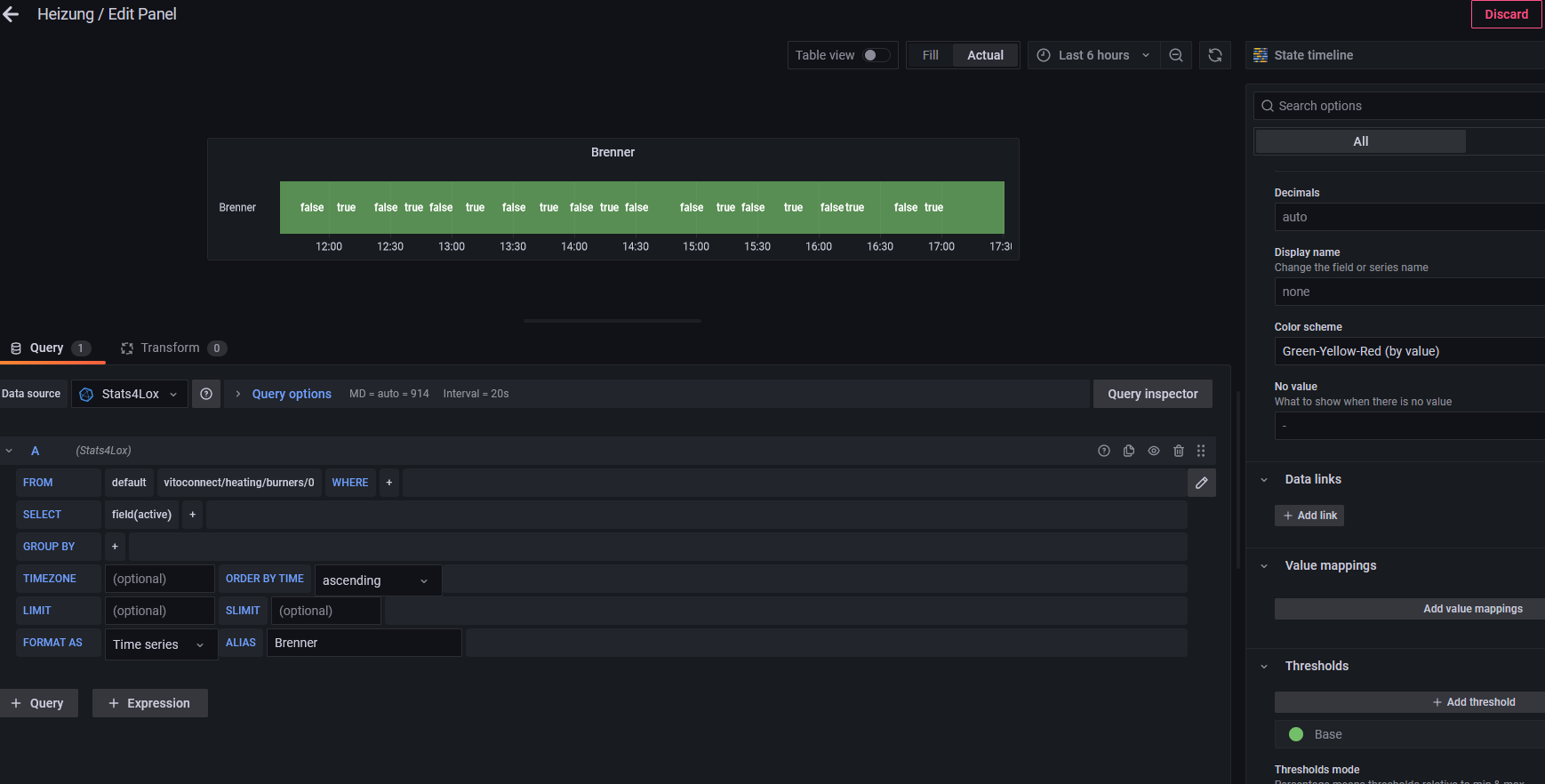 Wenn ich auf Table oder State Timeline umschalte, bekomme ich Werte angezeigt, wenn ich aber eine Anzeige Time seriens haben möchte, sehe ich keine Daten