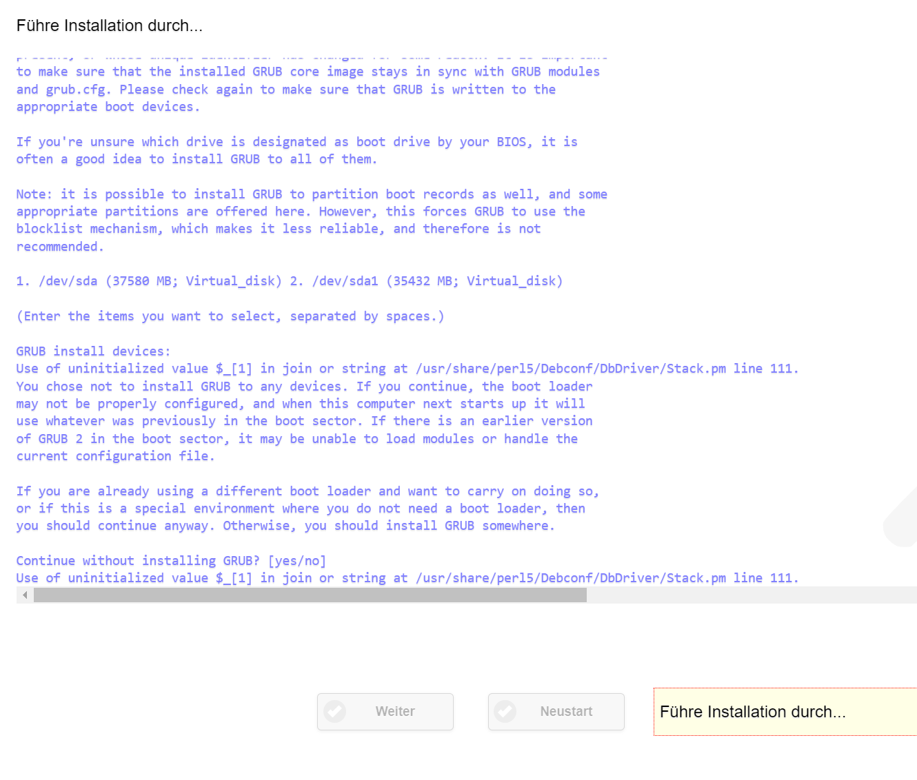 Da ist in der vm der bootloader kaputt oder nicht korrekt konfiguriert. Bei der Installation von Paketen schlägt das jetzt auf und er will eine Eingabe von dir, was du aber an dieser Stelle nicht kannst