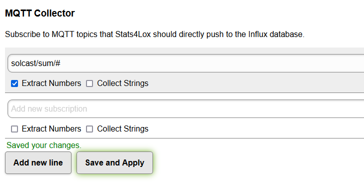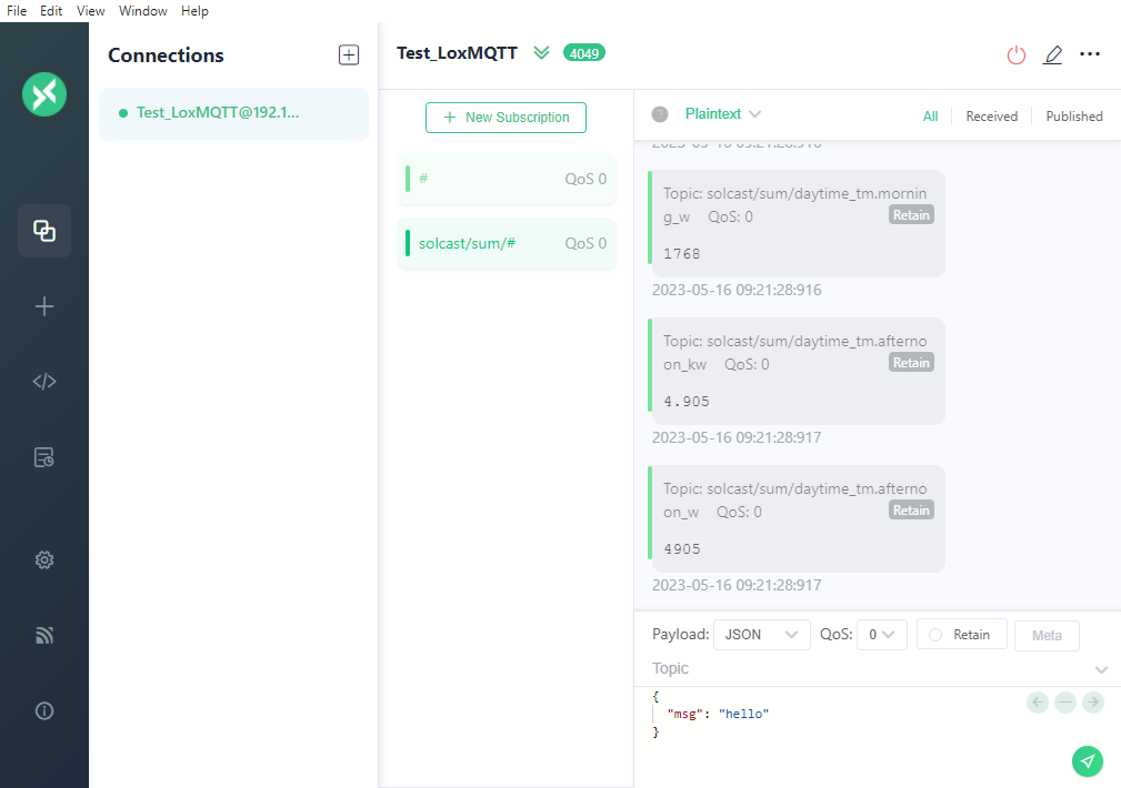 Auf einem MQTT-Client auf meinem PC (MQTTX wird zum Testen verwendet) kann ich Meldungen sehen, die sich auf das Vorübergehen von Solcast beziehen. Ich habe ein MQTT-Collector-Thema „solcast/#“ erstellt, sehe aber in Grafana keine Werte im Zusammenhang mit Solcast.