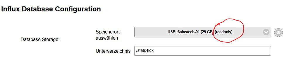 ich habe gerade festgestellt, dass mein USB Stick als Readonly angezeigt wird. Unter anderem finde ich auf dem Stick nicht das Verzeichnis, unter dem die Datenbank gespeichert ist. Könnte das das Problem sein, dass Influx nicht startet?