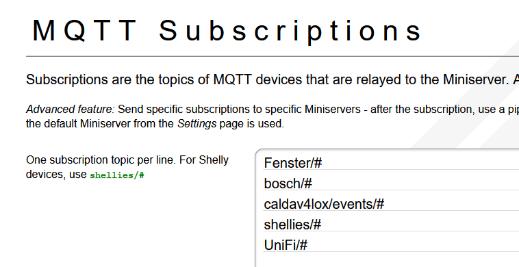 (Bild 1 Unifi-Plugin, Bild 2 MQTT Subscriptions, Bild 3 MQTT-Conversions, Bild 4 MQTT - Incoming Overview, Bild 5 Loxone Config)