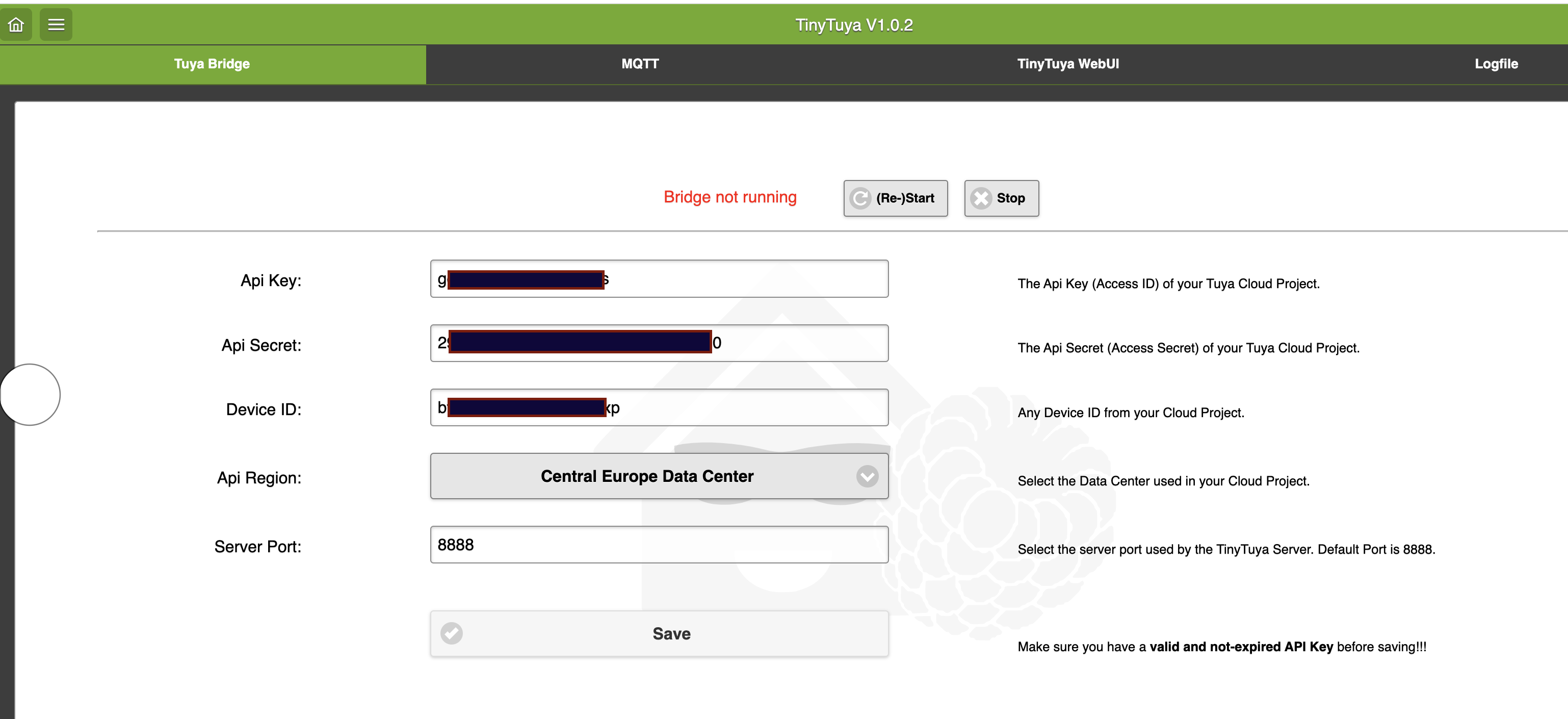 Die TinyTuya WebUI lässt sich aber nicht starten und es kommen keine Werte am MQTT Broker an.