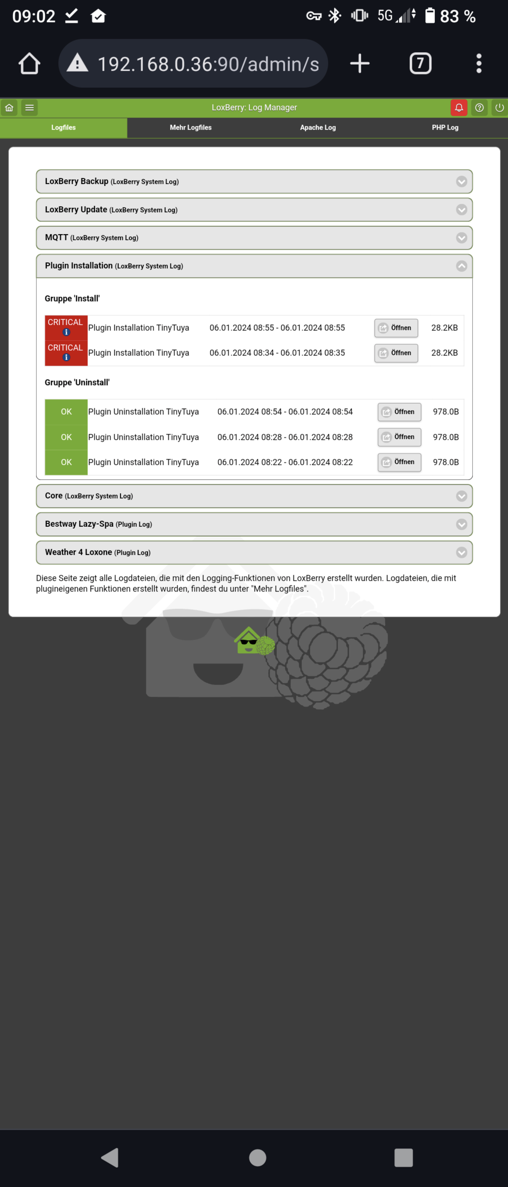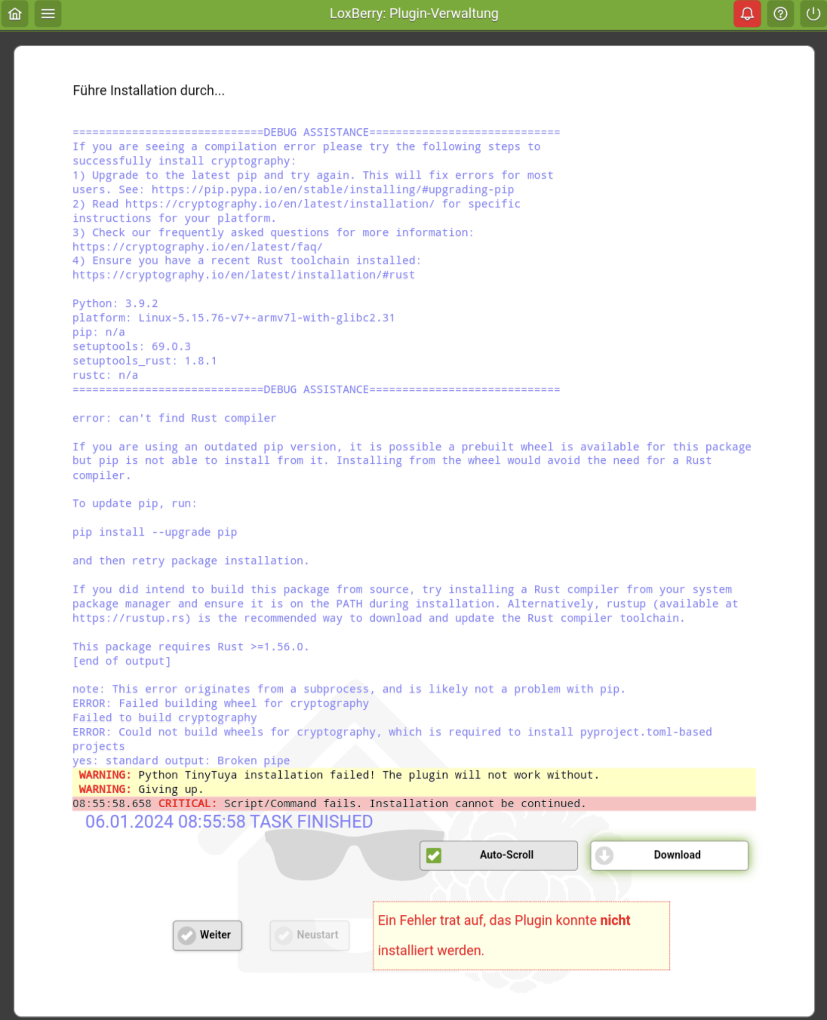 Ok, da gibt es ein Problem mit Python auf dem Raspbian (ich wusste schon, warum wir auf DietPi gewechselt sind...). Egal, bitte baue mal eine Verbidnung über das Remote Support Widget auf und schicke mir eine PN mit der URL und Deinem loxberry- und Root-Passwort und der SecurePIN. Dann versuche ich mal mein Glück das zu reparieren.