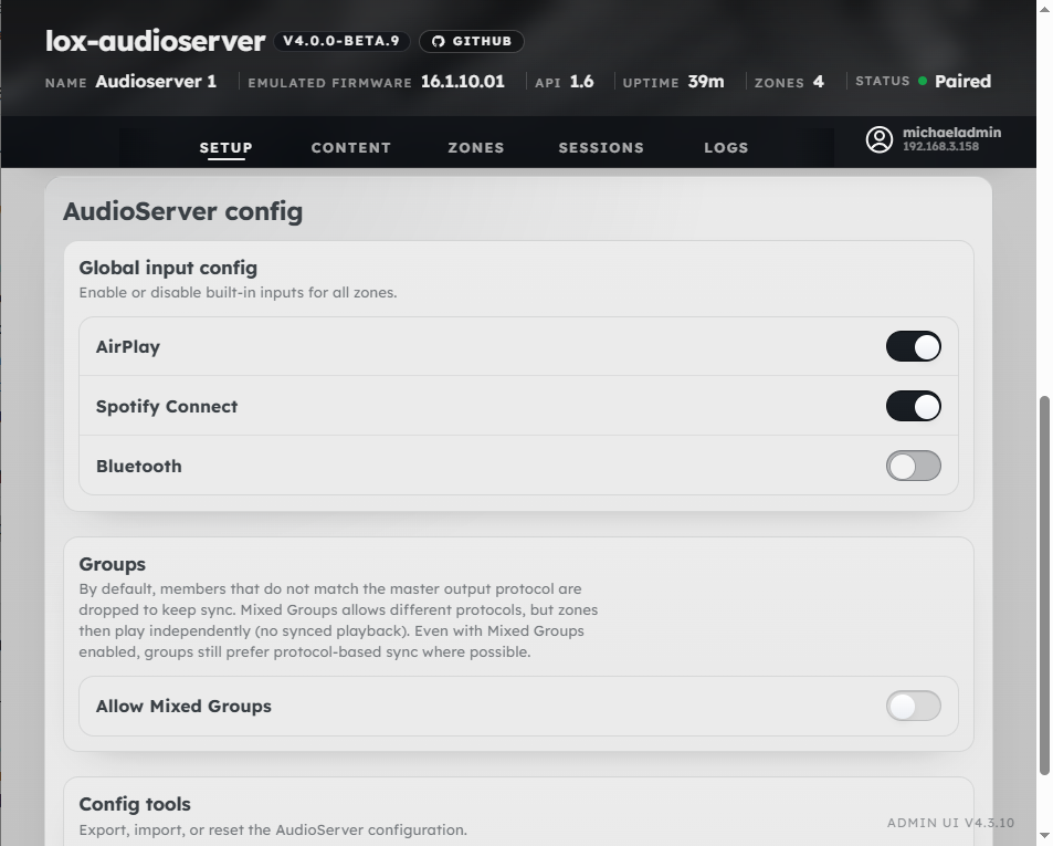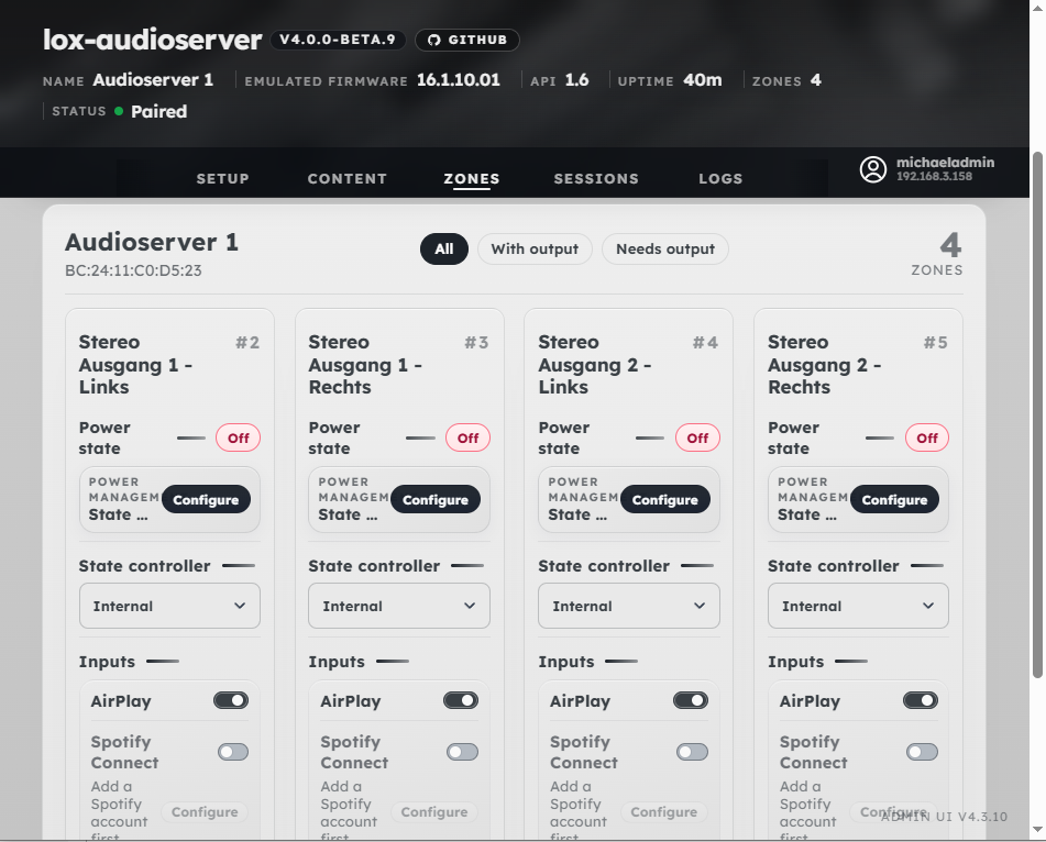 Lox-Audioserver bietet verschiedene Musikdienste als Quelle (Spotify, Apple Music, Youtube Music, Music Assistent, usw.), lokale Mediensammlungen und kann per AirPlay und Bluetooth "bestreamt" werden. Als Player können genutzt werden: AirPlay, Snapcast, Sendspin, Google Cast, Sonos und Squeezelite.