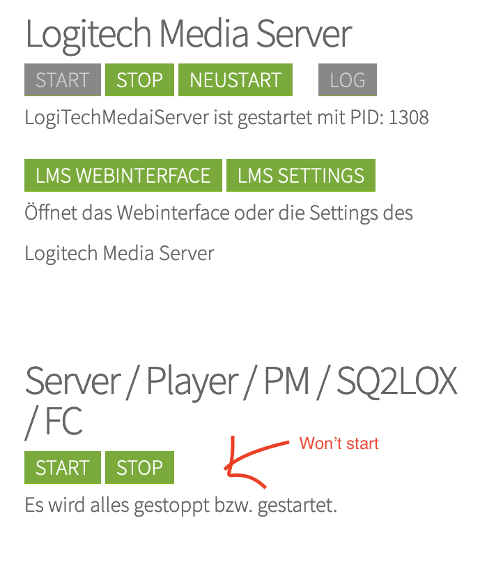 Now... I can't get the Player to start. I click on Start and nothing happens. I go to the LMS settings page and it shows "No player found".