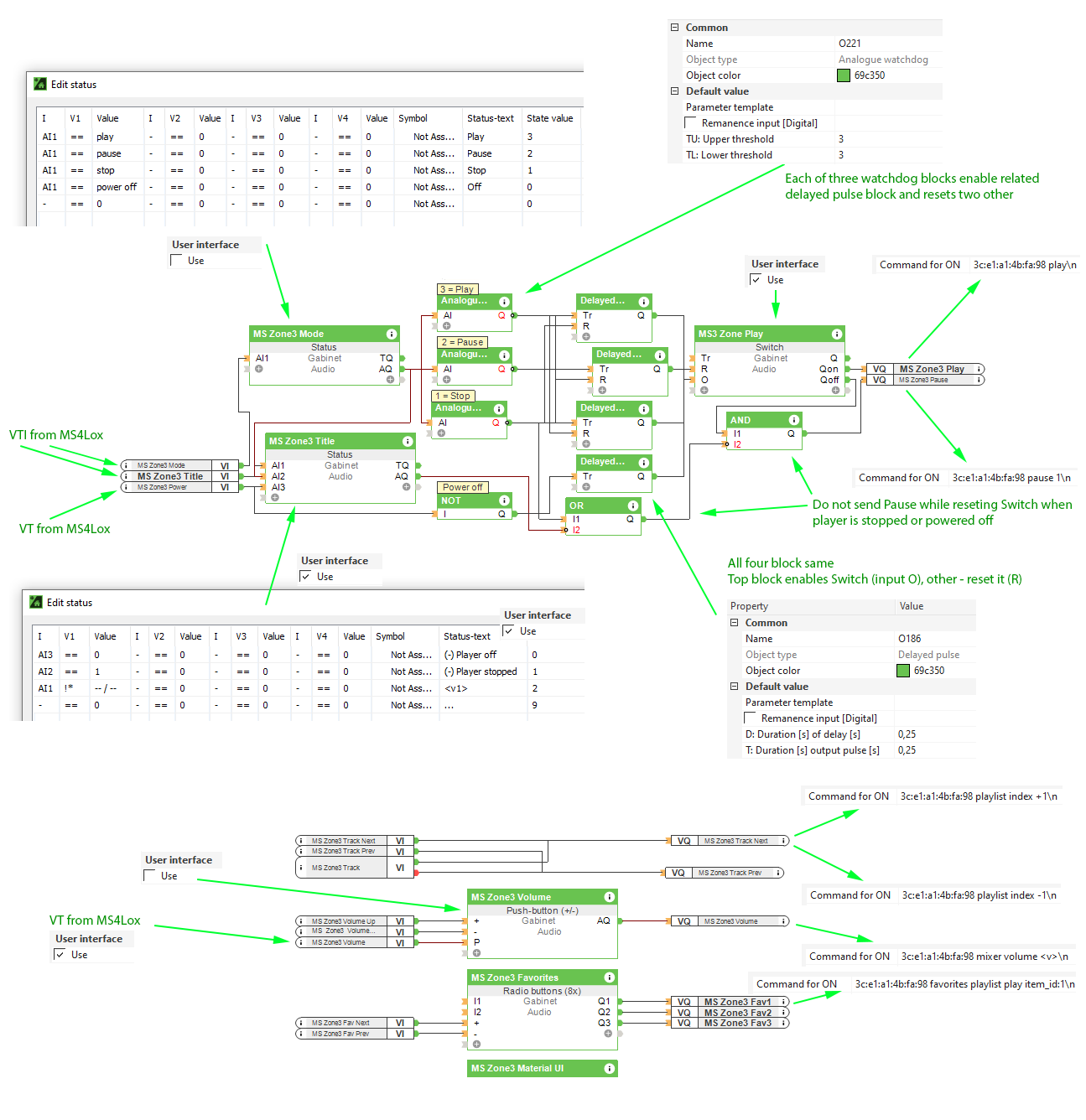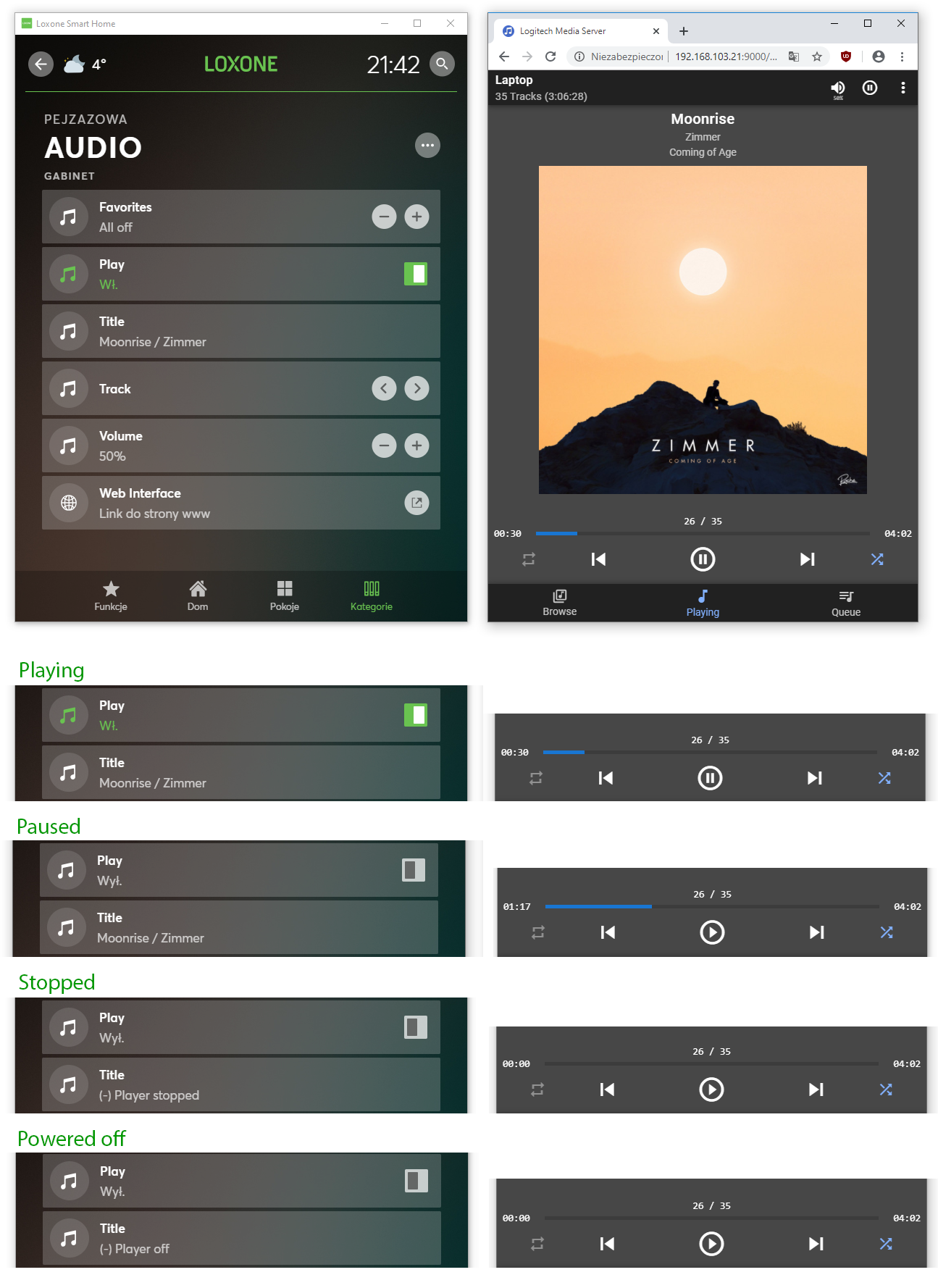 Same as in Spotify I don't care about stopping music (pausing is good enough) and also I don't care much if player is stopped or powered off as powering off might be automatic anyway. Having this in mind I tried to fit as much as it gets into two tiles / blocks and I've managed to fit: Play, Pause, Title, Stop status, Power status and indirectly Play & Pause status. Solution is probably not perfect but looks slick and seems to work fine (both ways: Loxone --> LMS, LMS --> Loxone).