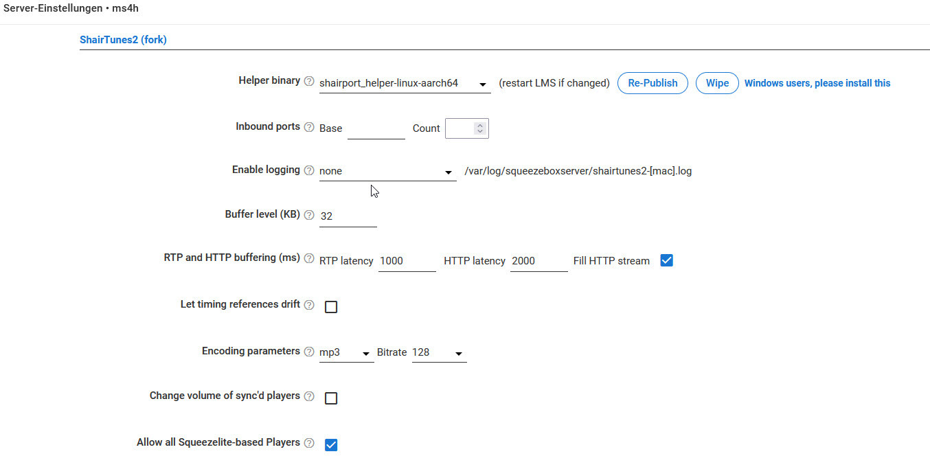 seit heute funktioniert Airplay über das ShairTunes2 Plugin (aktuelle Version, schon länger ohne Probleme in Verwendung) bei mir nicht mehr. Die Airplay Zonen werden angezeigt und können ausgewählt werden, es kommt aber keine Verbindung egal zu welcher Zone intern/extern zu Stande (Fehler Airplay Verbindung zu "Zonenename" nicht möglich). Ich sehe auch dass sich während des Verbindungsversuchs der User squeeze+ mit squeezeboxserve die komplette CPU des raspis nimmt, dann kommt die Fehlermeldung auf dem iPhone und die CPU geht wieder runter auf 2-3 %. Kann mir jemand helfen wie man das ggf. reparieren kann. An den Encoding Parameters hab ich verschiedene Einstellungen verändert - weiss jetzt nicht mehr was ich da urspünglich drin stehen hatte (s. Screenshot)