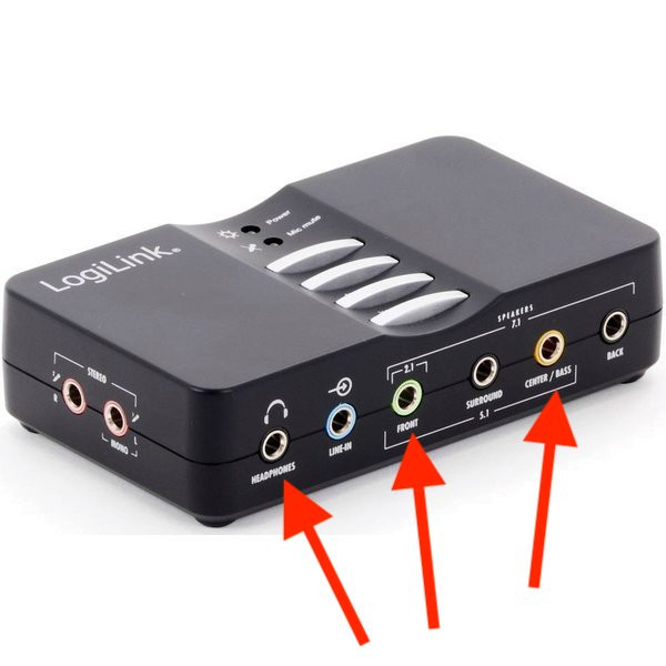 Nun wollte ich einmal schauen welche Buchse an der Soundkarte nun genau der Ausgangskanal 0 ist. Wenn ich einen Lautsprecher (günstiges Werbegeschenk) per Klinke anschließe (Verstärker-Bau kommt etwas später) dann bekomme ich auf allen 3 markierten Buchsen den Ton gleichzeitig wiedergegeben.