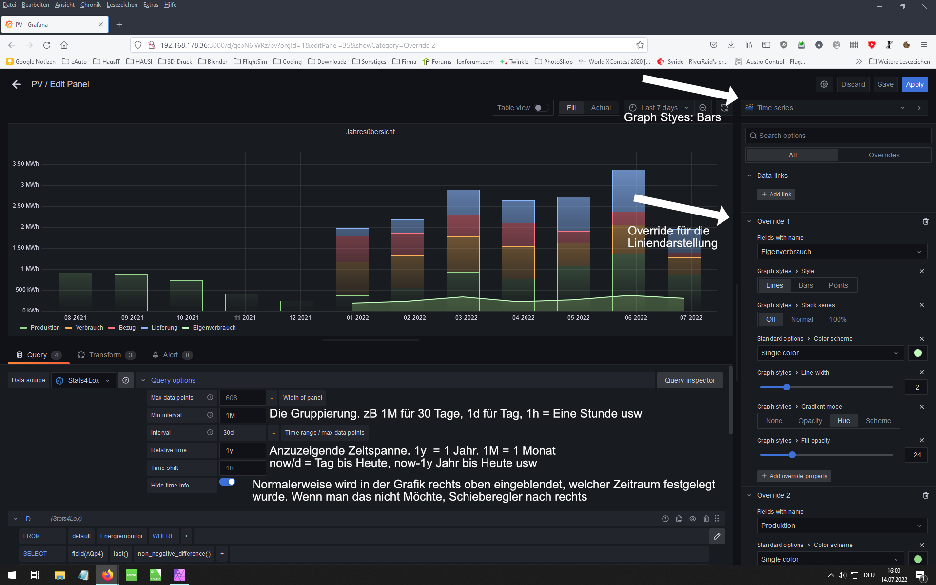 Gargamel "Sun and Moon" ist die Data Source und damit habe ich eine neue Query eingefügt. Grafik ist eine "Time Series". In der Query habe ich noch die Lat / Lon Werte für meinen Standort eingetragen. Mehr nicht