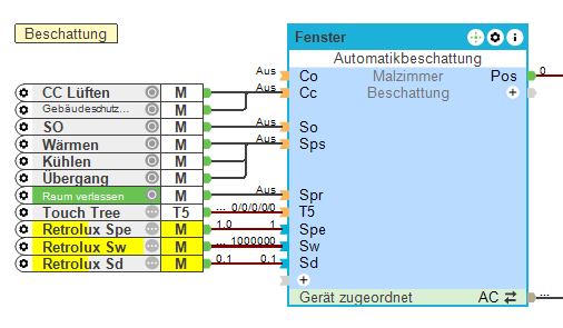 Ich habe mir das Ganze so vorgestellt, dass die Lamellen in der früh waagrecht gestellt werden. Habe ich bereits so programmiert. Wenn es drinnen jedoch zu warm wird will ich das die entsprechenden Raffstores komplett geschlossen werden, damit sich der Raum nicht noch weiter aufheizt. Nach der Beschattungszeit sollen sie wieder waagrecht werden.