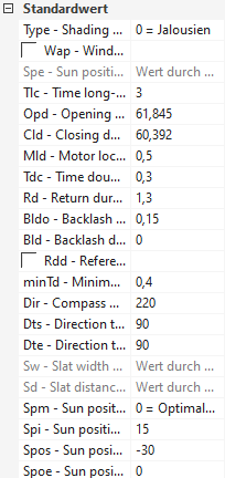 ogrimo30 Einige Parameter hängen direkt mit dem Beschattungselement (Hersteller, Abmessungen, ...), andere mit der "Einbausituation" zusammen.