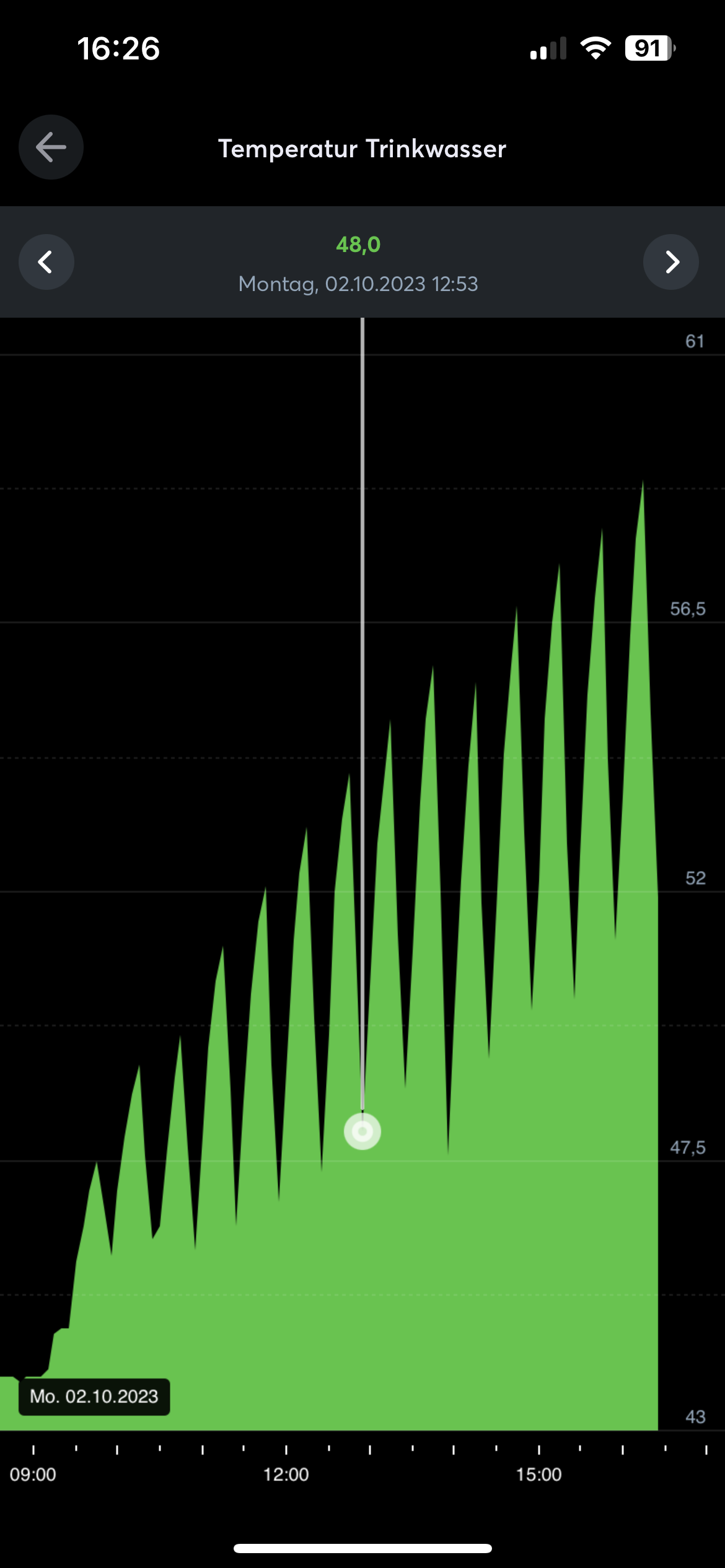 Nun zu meiner Frage: Ist es "normal" dass der Stab von sich aus alle 30 Minuten einen Takt hat? Klar ist, dass das Wasser um den Stab herum heißer ist, als im Rest des Speichers. Darum schaltet der Thermostat den Stab aus. Der Speicher durchmischt sich dann langsam und der Stab schaltet wieder ein. Alles komplett ohne Loxone Logik. Passt das so, oder würdet ihr da etwas daran optimieren?