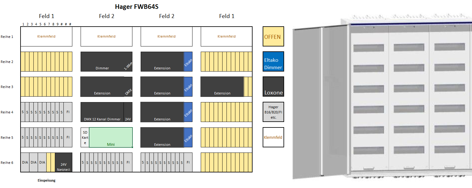 Loxone Komponenten waren zu dem Zeitpunkt der Bilderstellung noch nicht im Schrank, wobei da halt auch nur der MS mit ein paar Extensions einziehen darf (DMX, Air, Modbus, RS485, RS232, 1-Wire).