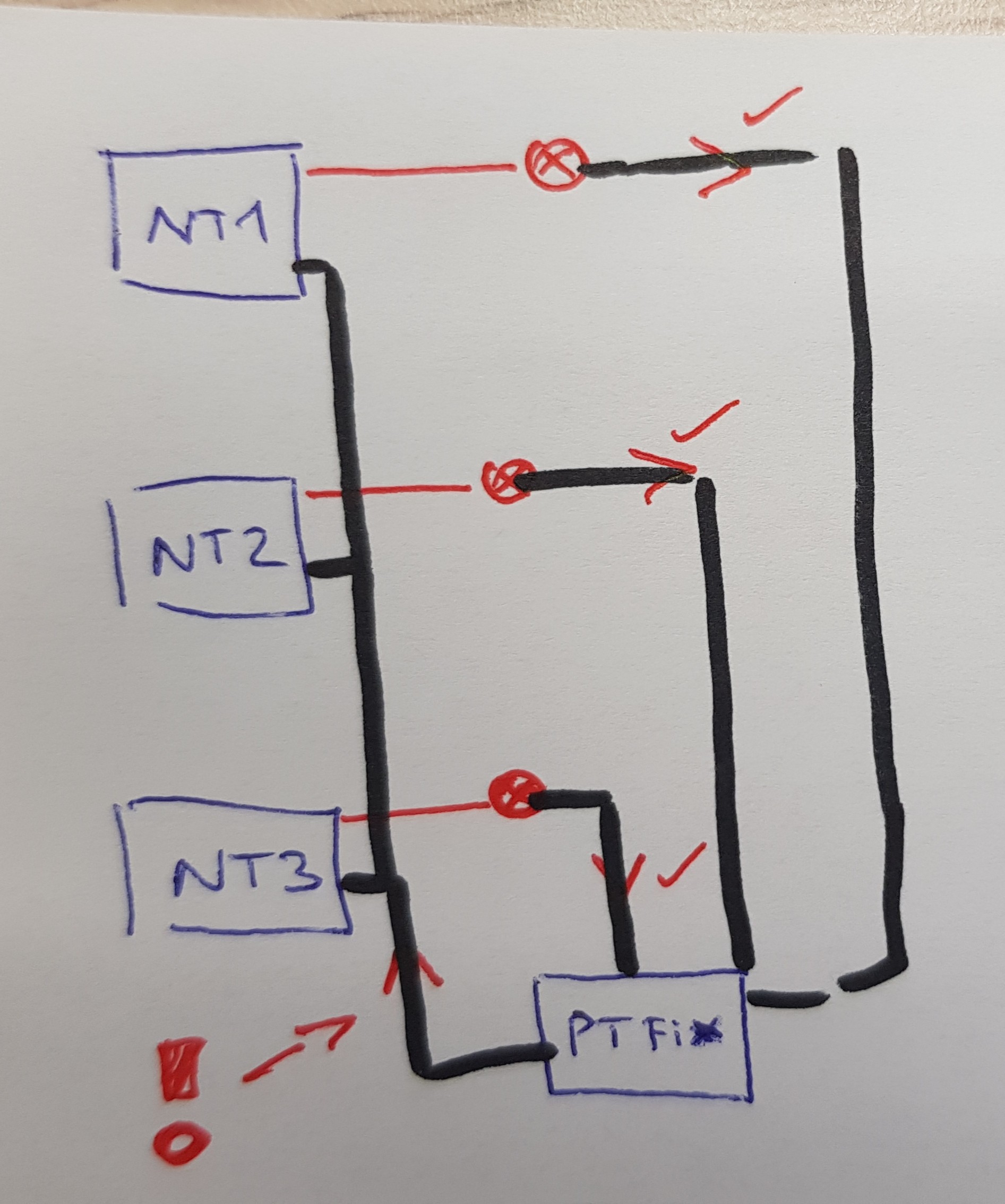 Problem ganz oben ist weil die GND sder einzelnen NT nicht einzeln zu den Verbrauchern verkabelt wurden sondern zentral über den PT Fix, daher müsste die GND Leitung vom PT Fix zu den Netzteilen den max. Strom können.
