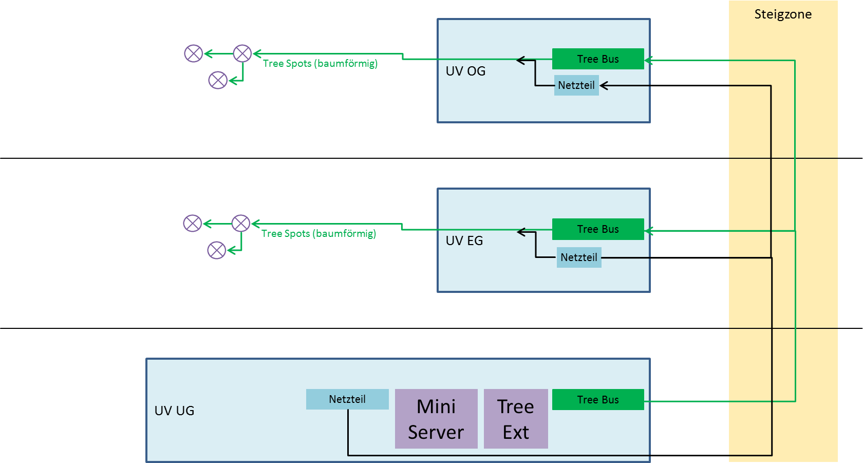 D.h. das Tree-Kabel ist zwischen den Geschossen nur mit den beiden Tree-Bus Drähten und der weissen 1.5mm2 Masseleitung durchverbunden und die orange 1.5mm2 Plusleitung bleibt unverbunden und wird nur innerhalb des Stockwerks mit dem dezentralen Netzteil durchverbunden.