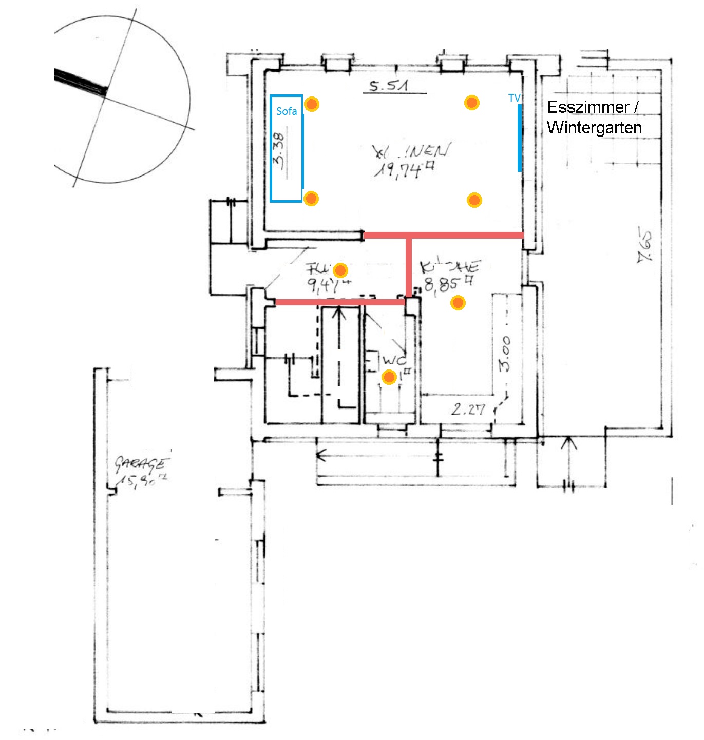 Die roten Linien sind, soweit ich mich erinnere, nur Deckenbalken, keine Wände, richtig?