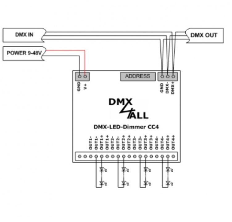 lt. Doku hat der dmx4all cc4 2 getrennte LED-Ansteuerungen mit jeweils +/-