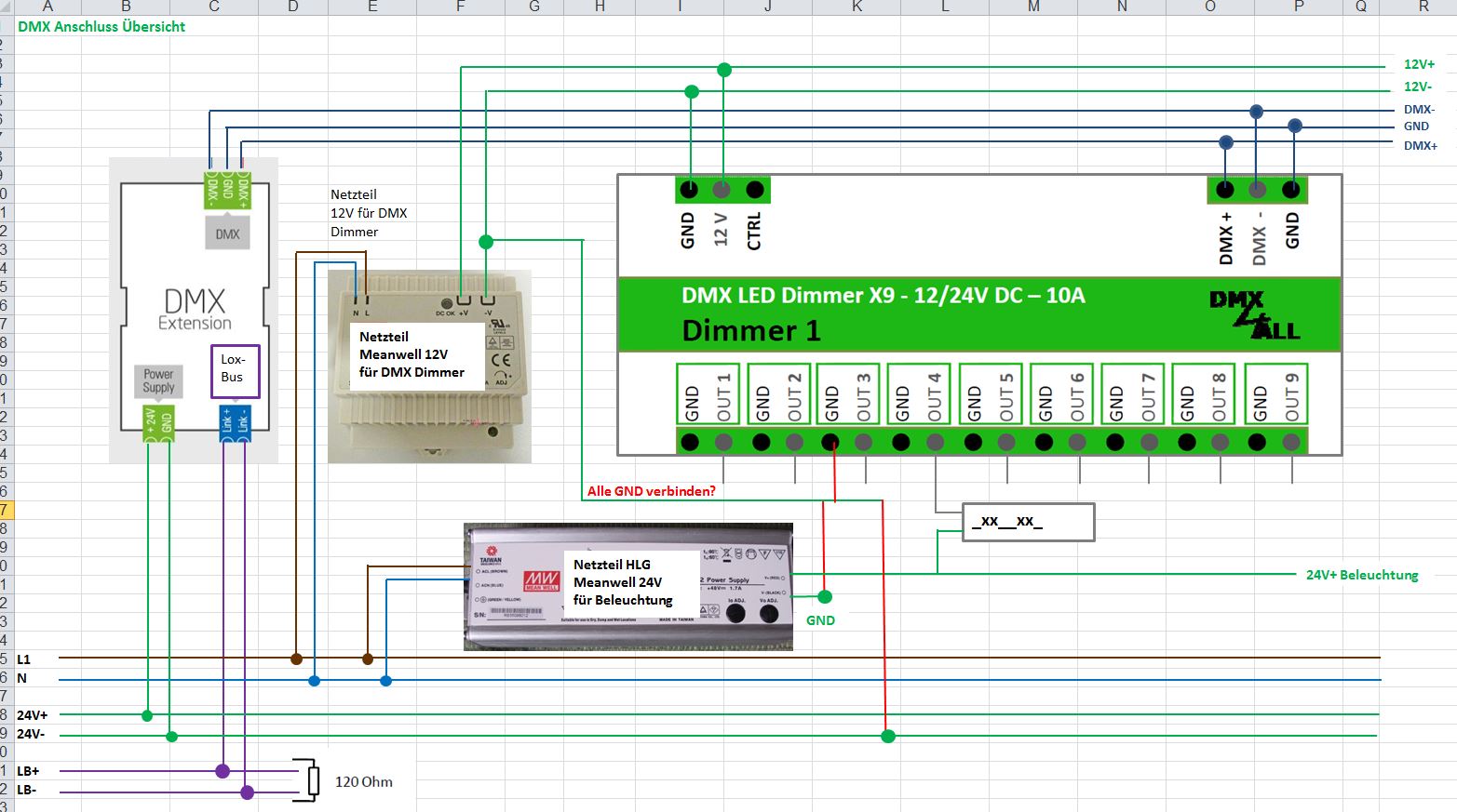 Hallo, bin gerade dabei meinen Verdrahtungsplan zu machen. Habe ein ähnliches Thema, allerdings auch eine Mischung von 12V und 24V. Welche meiner roten Verbindungen müssen sein, welche können sein? Habe eine Vorlage gesehen, dort sind die GNDs des DMX Dimmers überhaupt nicht verbunden.