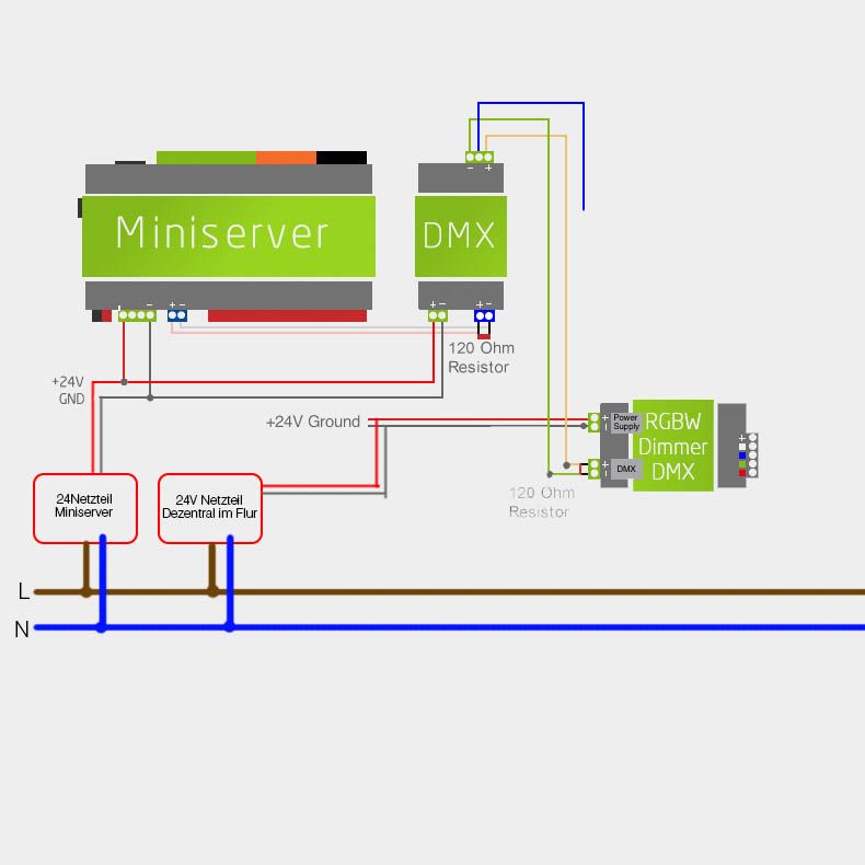 Was genau, hat es z.B. mit der blauen Leitung auf sich die an der DMX Extension die mittlere Klemme verlässt und dann in der Loxone Zeichnung den 24V Ground des Controllers erreicht.