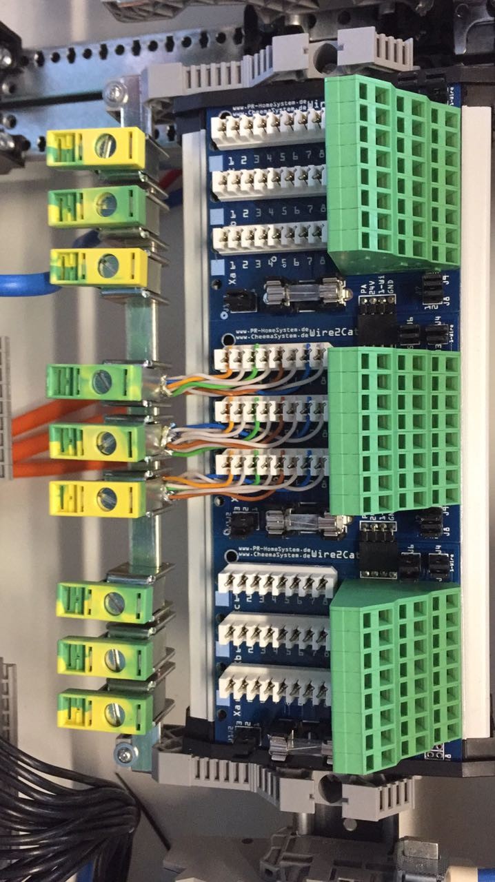 Die Klemmen werden im Schaltschrank auf Hutschiene montiert und zur Loxone hin verkabelt. Die CAT Leitungen kann man dann später entsprechend seiner Planung auflegen.