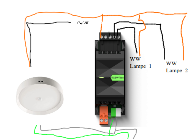 Ich habe aktuell eine warmweiße 24V Lampe an einem RGBW Dimmer angeschlossen, welche ich gerne gegen eine LED Ceiling Light RGBW Tree austauschen würde (Tree habe ich dort natürlich)